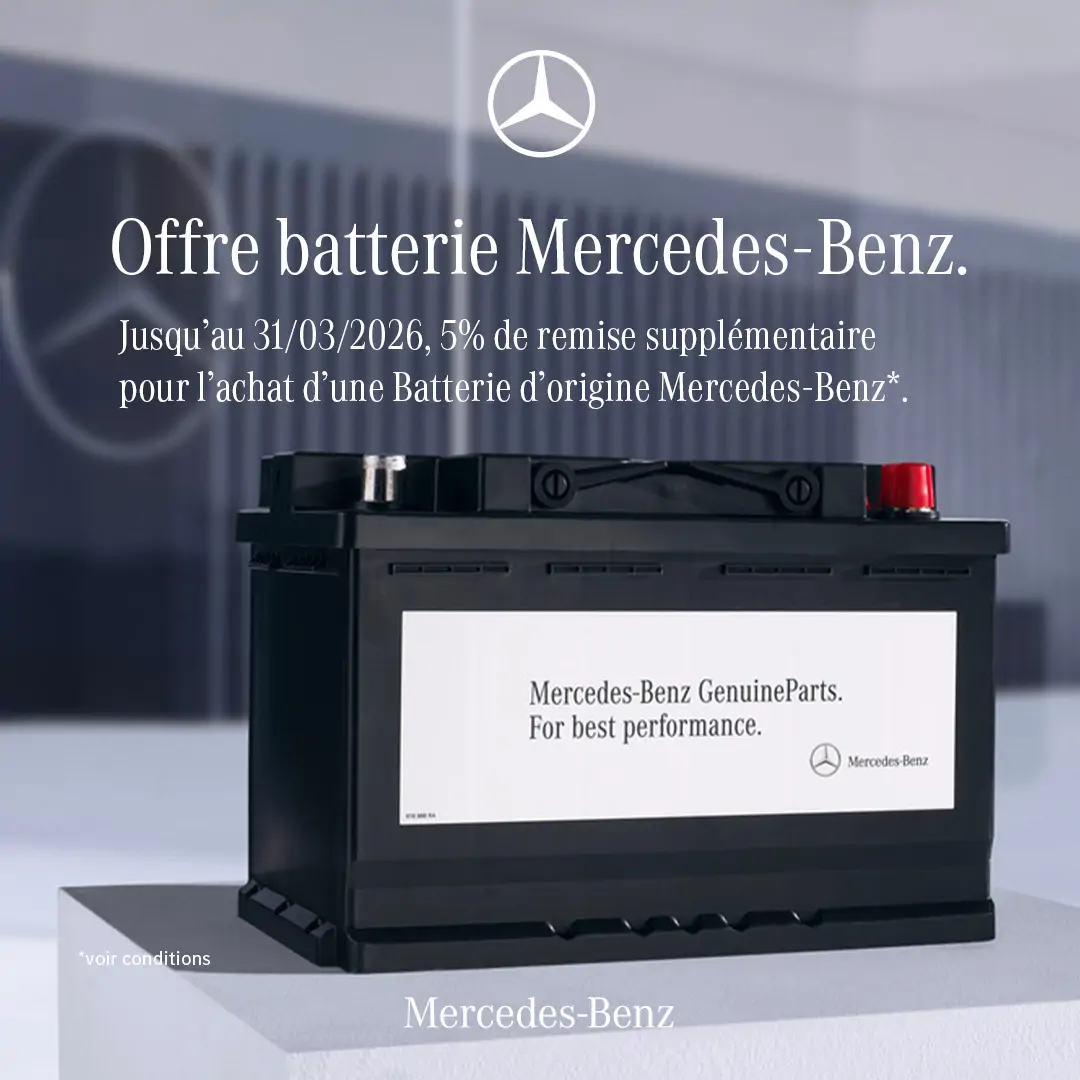 Jusqu’au 31/03/2026, en plus de votre remise habituelle, une remise additionnelle de 5% vous est offerte pour l’achat d’une Batterie d’origine Mercedes-Benz*.