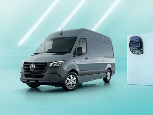Modèle présenté : eSprinter 314 Fourgon 37 3,5t PRO, avec capacité de batterie 81 kWh, toit surélevé, phares LED, jantes alliage 16 pouces et peinture bleu-gris, 60 000km, 1er loyer majoré de 5 250 € HT, puis 59 loyers de 439 € HT (TVA au taux en vigueur en sus, hors prestation et assurance). Offre réservée aux professionnels, personne morale, à l’exception des collectivités, ayant moins de 100 véhicules dans son parc automobile, dans le cadre d’une location ≥ 24 mois, au tarif remisé du 01/01/26, valable dans la limite des stocks disponibles pour toute commande d’un véhicule neuf en stock avant le 30/06/26 et livraison avant le 30/06/26 chez les distributeurs participants, sous réserve d’acceptation du dossier par Mercedes-Benz Financial Services SA, 7 av. Niepce, 78180 Montigny. RCS Versailles 304 974 249, N° ORIAS 07009177.