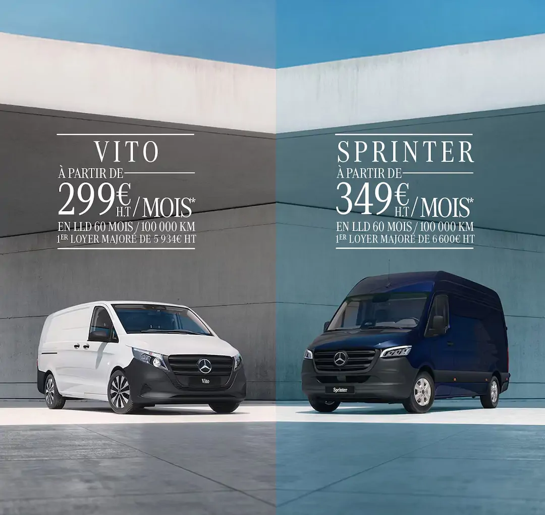 Modèle présenté : Vito 114 CDI Fourgon long PRO, avec jantes alliage 17 pouces doubles branches et peinture bleu vintage, 100 000km, 1er loyer 6 600€ HT, suivi de 59 loyers de 319€ HT incluant l'extension de la garantie, l’entretien et le remplacement des pièces d’usure pour une durée de 60 mois ou 100 000 km (TVA au taux en vigueur en sus). Offre réservée aux professionnels, hors loueurs et flottes, dans la limite des stocks disponibles, au prix tarif remisé du 01/01/2026, valable pour toute commande d’un Vito Fourgon du 01/04/2026 au 30/06/2026, livré avant le 31/12/2026, chez les distributeurs Mercedes-Benz agréés participants, sous réserve d’acceptation du dossier par Mercedes-Benz Financial Services SA, 7 av. Niepce, 78180 Montigny. RCS Versailles 304 974 249, N° ORIAS 07009177. Pour plus de renseignements, contactez votre distributeur agréé Mercedes-Benz. Contrat Complete. Pour connaître en détail les prestations des contrats Mercedes-Benz ServiceCare, rapprochez-vous de votre Distributeur Réparateur Agréé Mercedes-Benz.