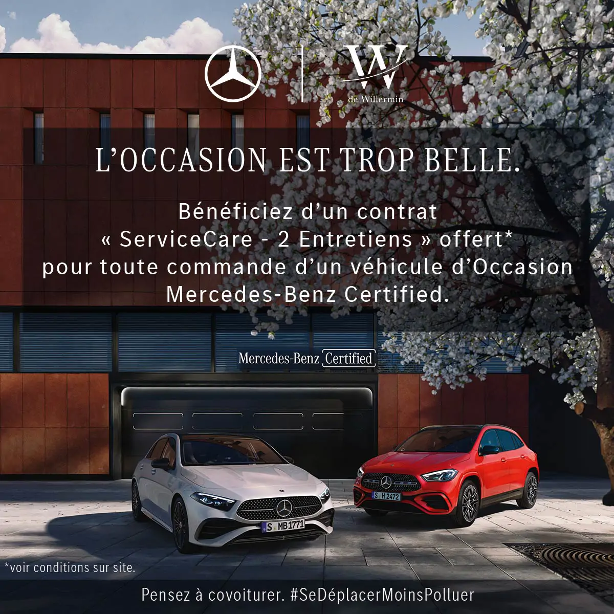 *Bénéficiez d’un contrat service Mercedes-Benz « ServiceCare 2 entretiens » offert pour toute commande par un particulier ou un professionnel, d’un véhicule d’occasion Mercedes-Benz Certified (Hors Classe X, Classe V, Classe G, Classe T et EQV, EQT) entre le 14/03/2026 et le 04/04/2026 et livré avant le 15/06/2025. Les 2 entretiens sont à réaliser parmi les services suivants et selon les préconisations constructeur : interventions de maintenance programmées, remplacement des filtres (à huile, à air, à carburant et d’habitacle), vidange de liquides (remplacement du liquide de frein et l’huile de boîte), vidange d’huile (pour le moteur et la boîte automatique), service de mobilité (service de dépannage et de remorquage), appoint de liquides (AdBlue et liquide lave-glace). Offre non cumulable avec d’autres offres et/ou avantages en cours, soumise à conditions, dans la limite des stocks disponibles. Sont exclus du bénéfice de l’offre les loueurs ainsi que les professionnels destinant le véhicule au secours, à la compétition, aux auto-écoles, aux flottes. Pour les clients taxi et VTC, seuls les véhicules Mercedes-Benz Certified de moins de 24 mois et moins de 30 000 km sont éligibles à cette offre. Voir conditions et détails sur mercedes-benz.fr. Photo non contractuelle. RCS Versailles - SIREN 622 044 287.